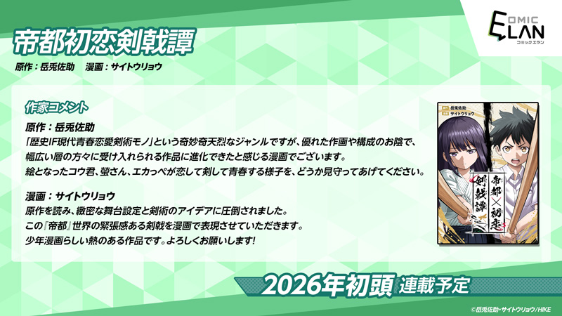 2026年初頭に「COMIC ELAN」にて、『帝都初恋剣戟譚』の連載が決定いたしました!