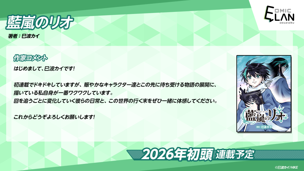 2026年初頭に「COMIC ELAN」にて、『藍嵐のリオ』の連載が決定いたしました!